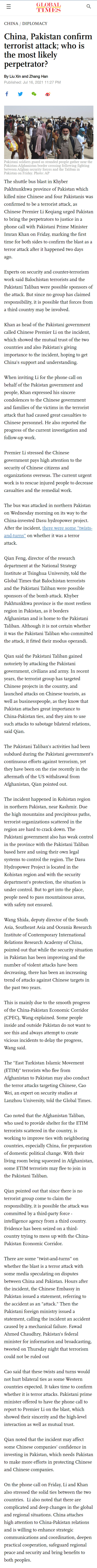 Global Times – China, Pakistan confirm terrorist attack; who is the most likely perpetrator?